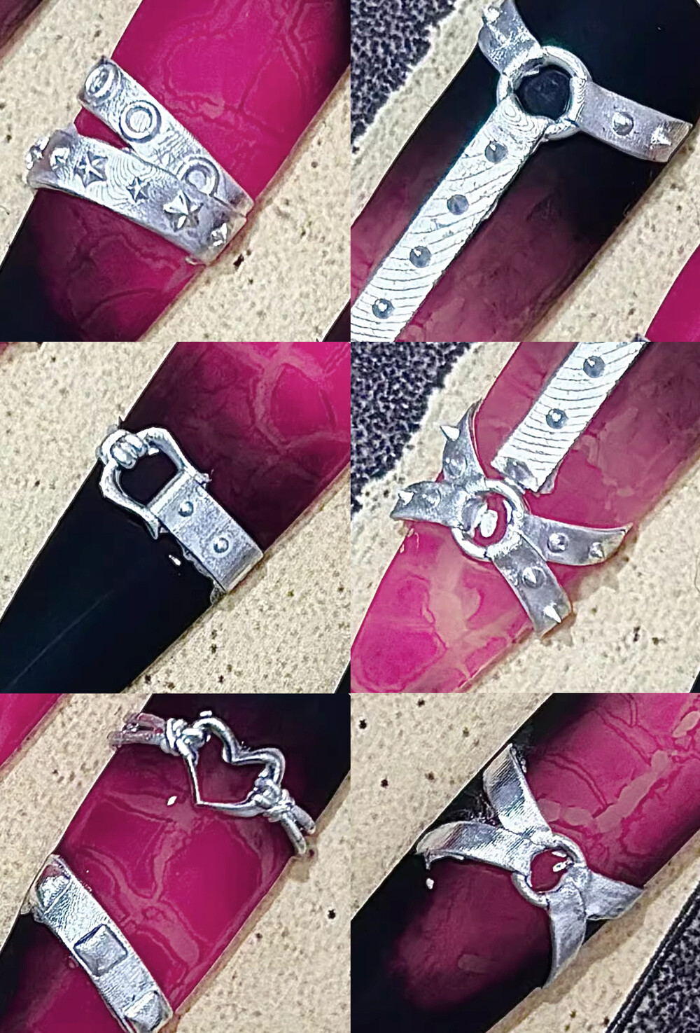 힙한 갸루 네일을 연출할 수 있는 벨트 버클 소프트 몰드입니다. 하트 버클 무슨 일,,? 엄지나 중지 포인트로 너무 예뻐요!! 펑키 한 리벳 찡들도 다양한 디자인으로 별 , 뾰족이 , 스퀘어 , 원형 등등 디테일 최고랍니다. 몰드로 간편하게 벨트 파츠 만들어 보아요 🖤