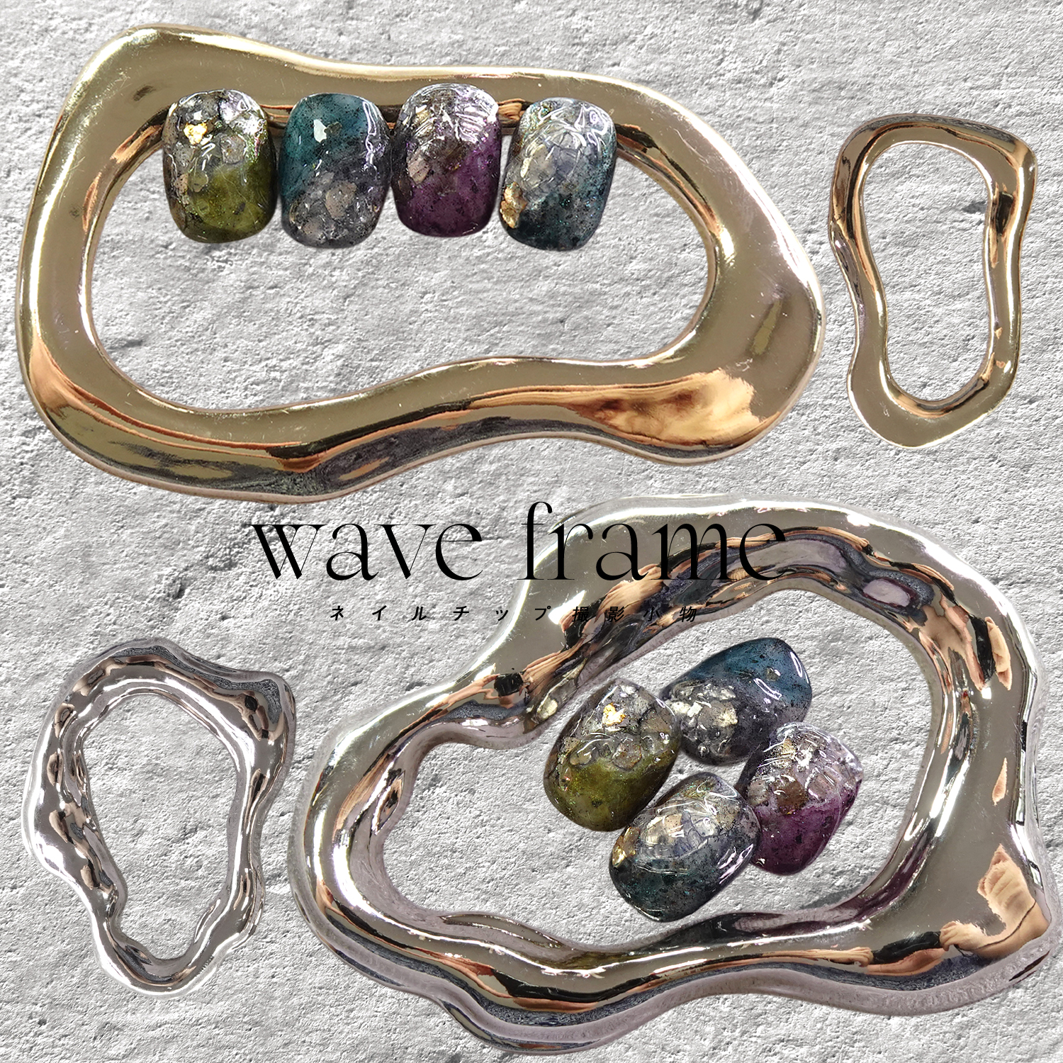 유려하게 흐르는 웨이브 라인과 메탈릭한 광택이 만나 네일팁 촬영에 한층 고급스럽고 세련된 분위기를 더해줍니다.