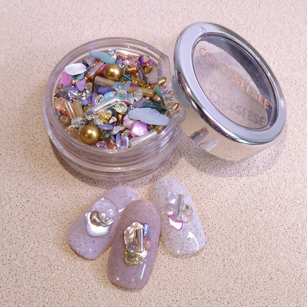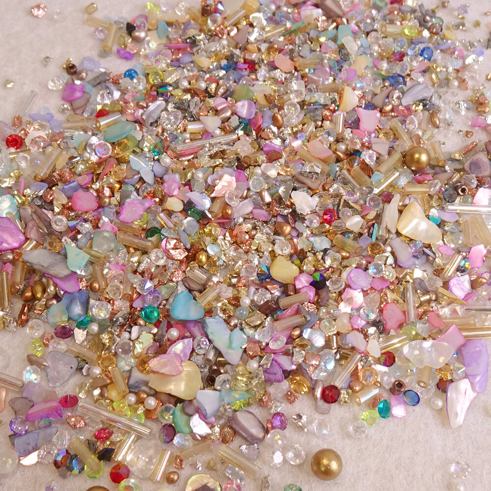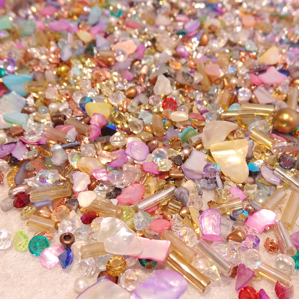 세상 영롱, 자개랑 비즈 조합은 사랑이조 ♡ 자스민 공주가 떠오르는 금은보화 가득한 알록달록 뉘앙스 자개 믹스입니다. 색감이 다양해서 잡히는데로 대충 조합해서 아트해도 예쁘고 뉘앙스 네일에 활용도 높아요. ୨୧ ❛ᴗ❛)✧