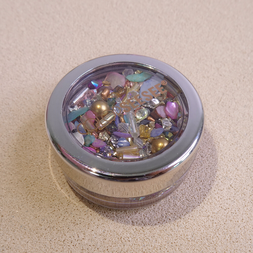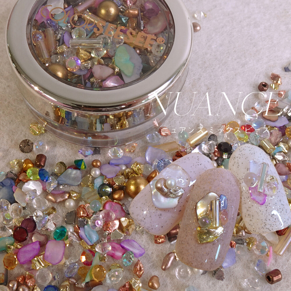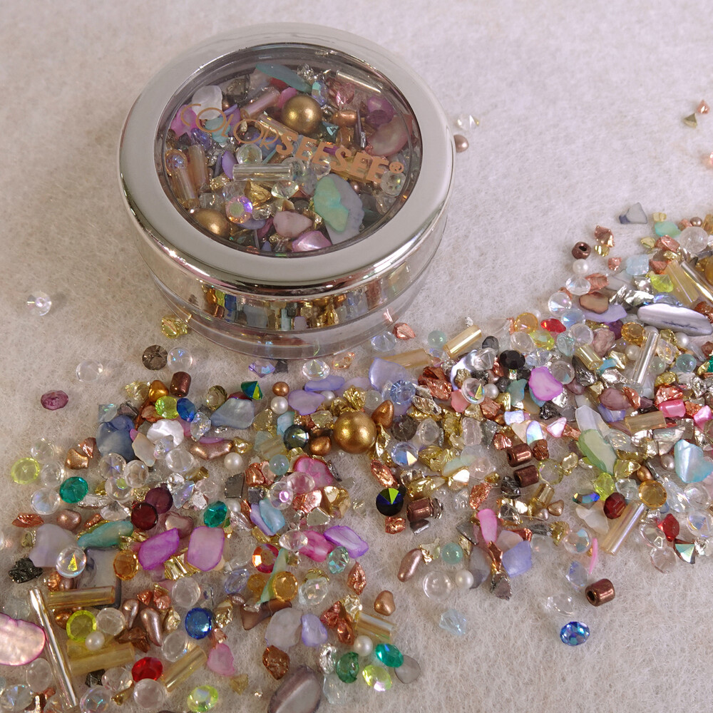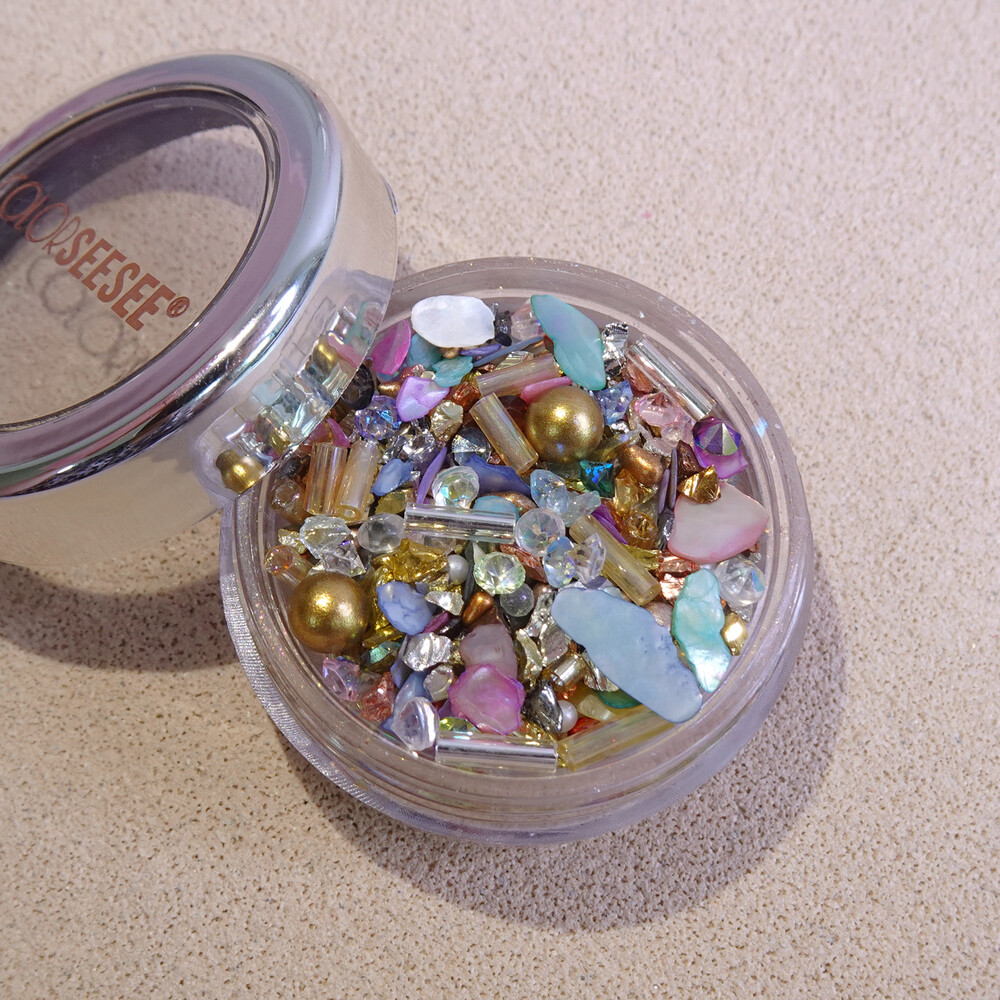 세상 영롱, 자개랑 비즈 조합은 사랑이조 ♡ 자스민 공주가 떠오르는 금은보화 가득한 알록달록 뉘앙스 자개 믹스입니다. 색감이 다양해서 잡히는데로 대충 조합해서 아트해도 예쁘고 뉘앙스 네일에 활용도 높아요. ୨୧ ❛ᴗ❛)✧