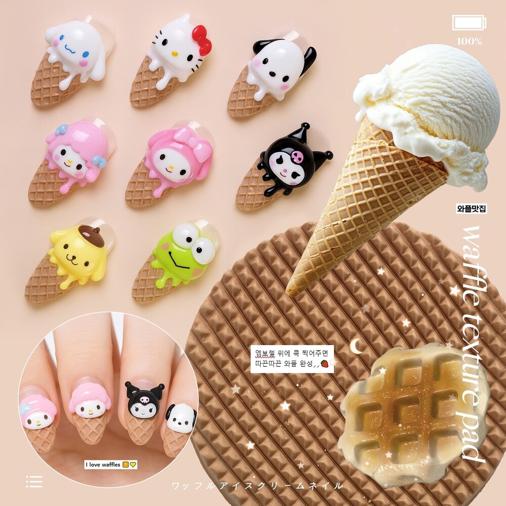 아이스크림콘·와플·웨하스 등 다양한 디저트 질감을 연출할 수 있는 와플 텍스처 패드입니다. 손톱 위에 살짝 포개듯 눌러 찍어주면 귀엽고 리얼한 와플 콘 질감 아트 완성! 귀염 뽀짝한 산리오 아이스크림 네일에 도전해보세요 🍦💛