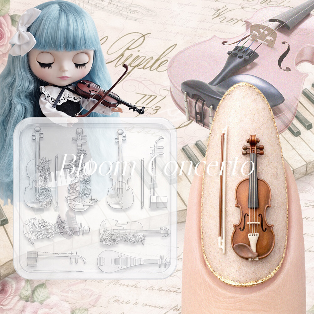 바이올린, 장미, 첼로, 해금, 비파 등 다양한 동서양의 악기들이 들어간 블룸 콘체르토 몰드입니다. 섬세한 디테일로 요즘 유행하는 빈티지 네일에 포인트로 바이올린을 올려주면 분위기 끝판왕 이에요 실제로 보면 미니한 사이즈로 작은손톱도 사선으로 아트하면 부담없이 사용 가능하답니당 ✶