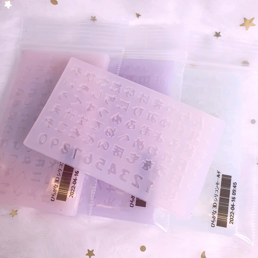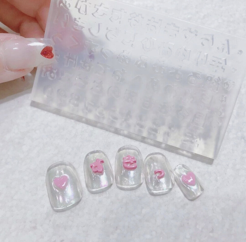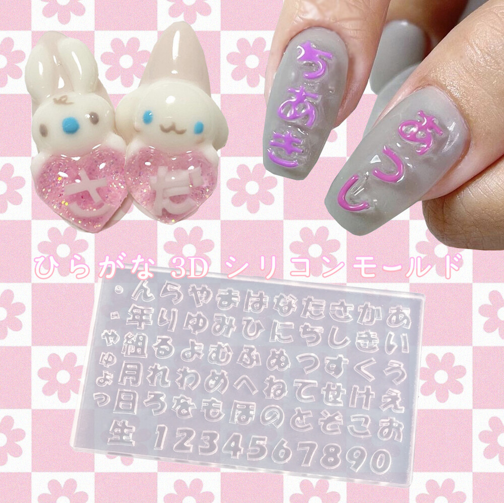 도쿄 핫! 키치네일 스트릿 네일 등에 포인트로 올려주면 유니크하고 귀여운 엠보 통통한 히라가나 몰드 입니다. 숫자도 같이 포함되어 있어서 생일이나 닉네임 등 귀여운 단어를 조합해서 파츠 만드는 재미가 아주 쏠쏠해요. 글씨도 쪼꾸미해서 하트몰드안에 가둬주면 넘 예쁘고 키치 하답니다 ♡⁼³₌₃