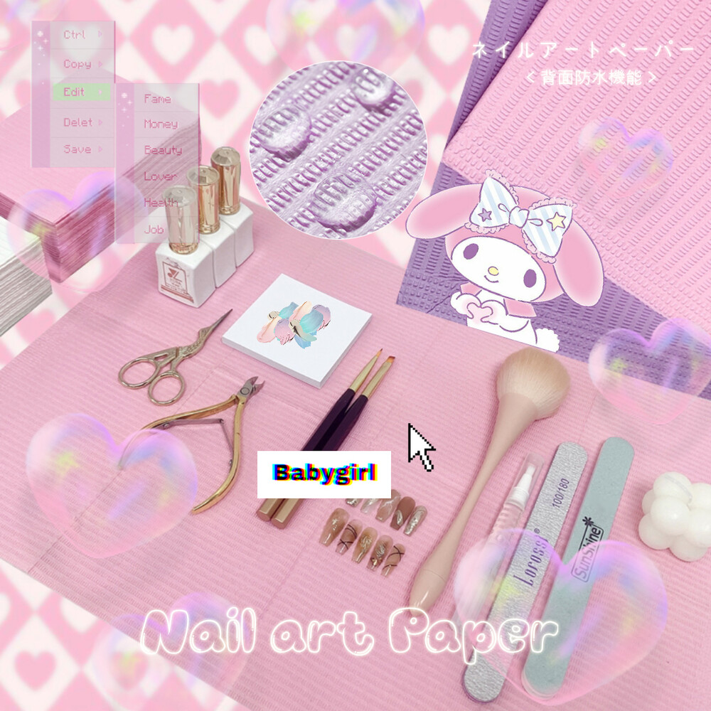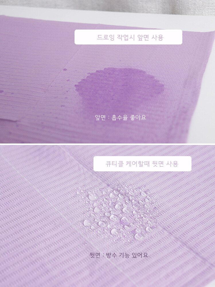네일 작업시 패드로 사용하는 아트 페이퍼 입니다. 뒷면은 방수기능이 있어서 큐티클 케어할때 사용하기 좋고 앞면은 반대로 흡수율이 높아 수채화 물감이나 젤 컬러 다룰때 사용하심 좋습니다. 페이퍼 사이즈도 큼지막해서 파우더나 글리터 아트 할때 강추구요 색상도 핑크 퍼플로 귀여워서 작업 중간 중간 아트 사진 찍거나 영상 촬영하면 예쁘게 잘 나온답니다! ๑•᎑•๑ ♬*゜