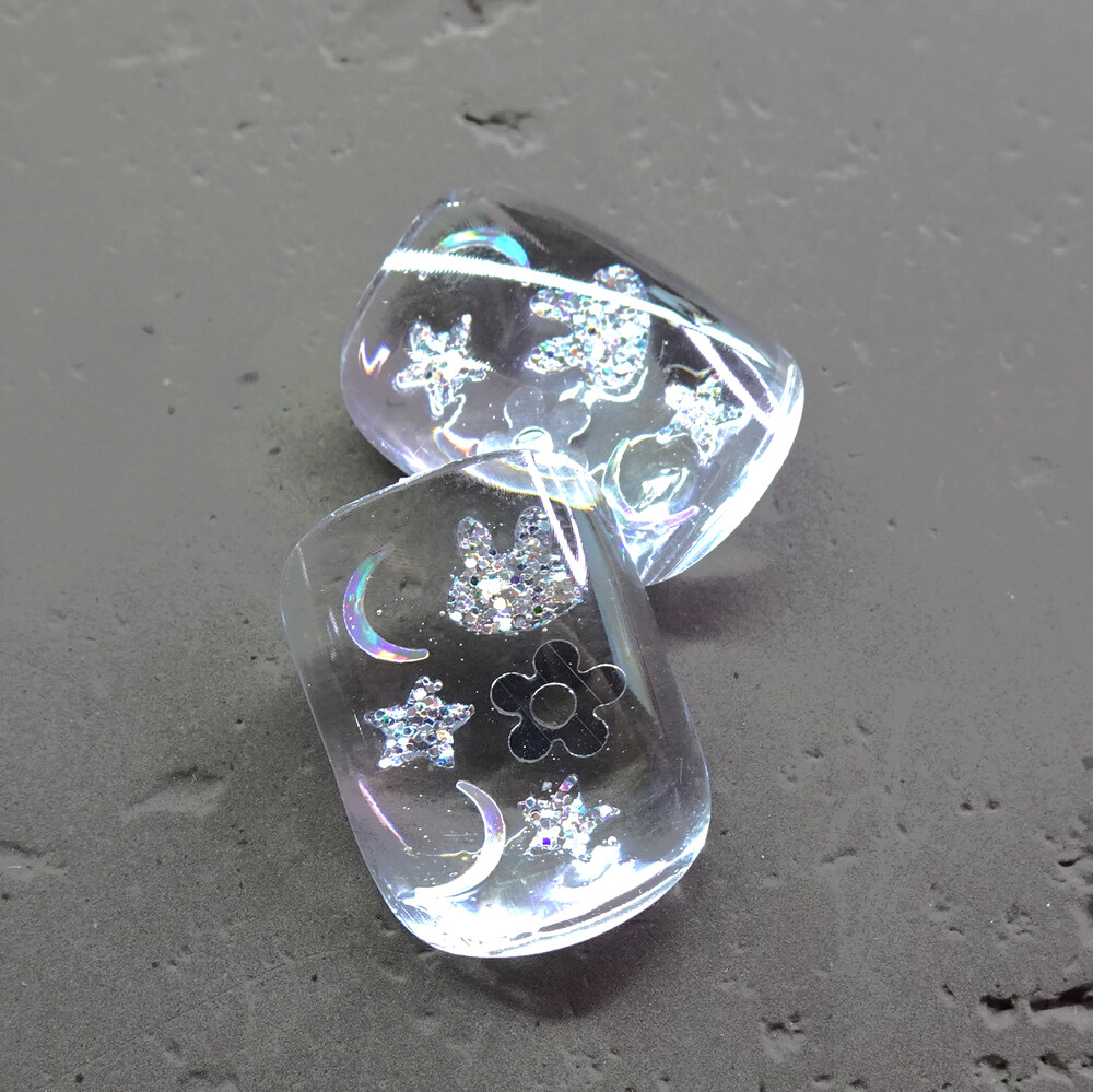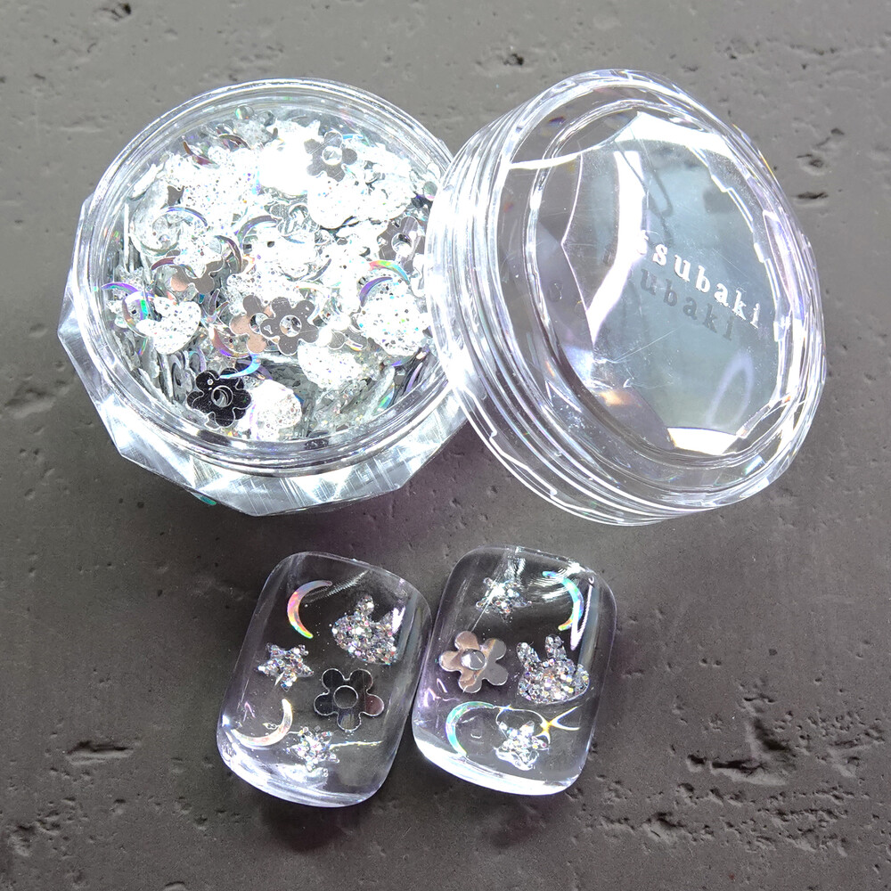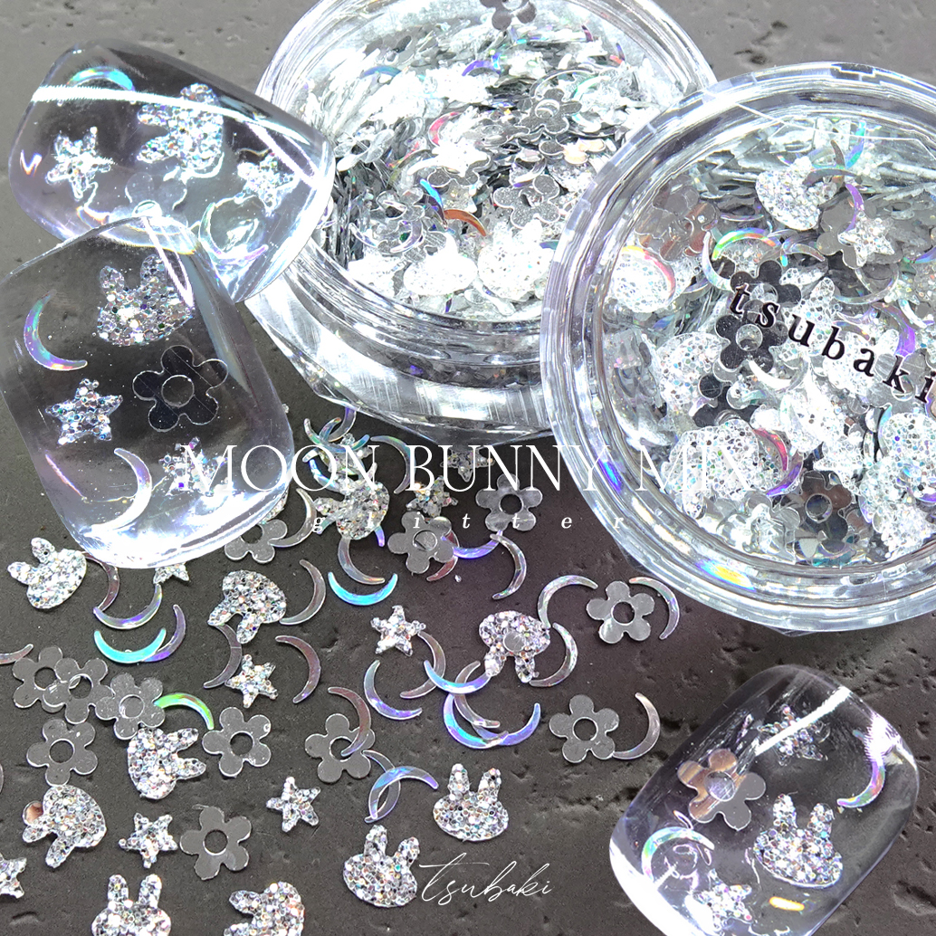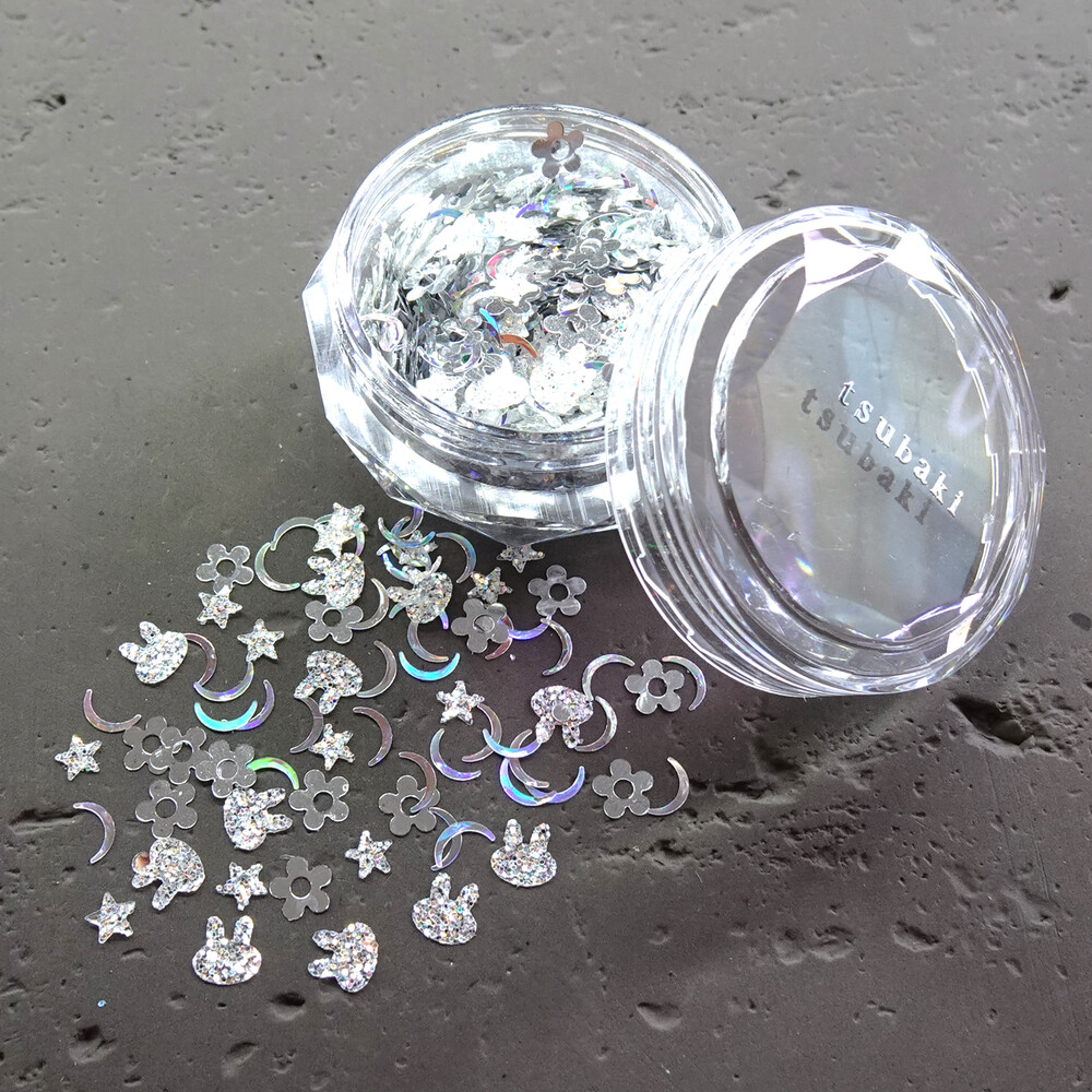 봄의 무드가 느껴지는 달·토끼·별·꽃 조합의 스파클 믹스 글리터입니다. 특히 토끼와 별 모양이 다이아몬드처럼 반짝여, 탑젤을 얹어주면 실물이 정말 영롱하고 예뻐요! 클리어 바탕에도 잘 어울리지만 자석젤 베이스 위에서도 너무 아름답게 표현돼요. 깨끗하고 심플한 느낌으로 여러 아트에 포인트 주기 좋아요.🌙🐰⭐️🌸