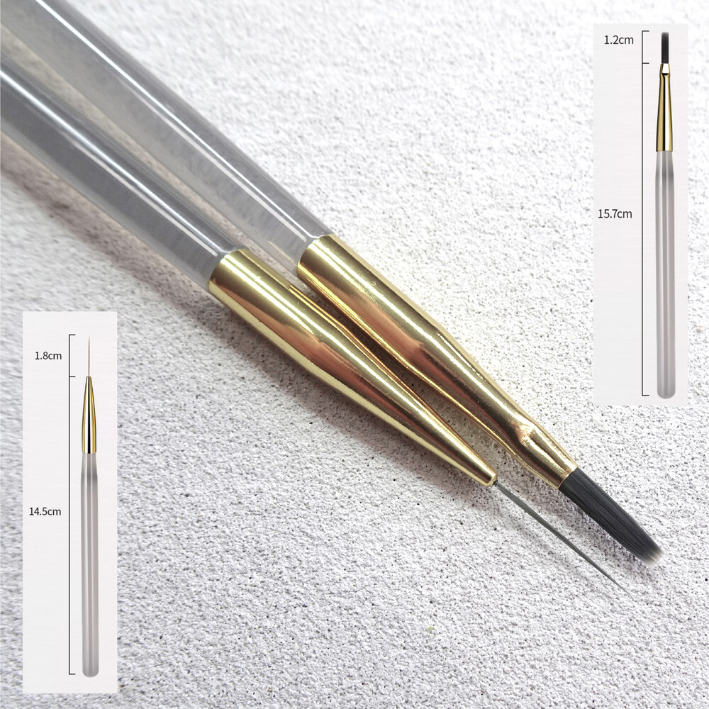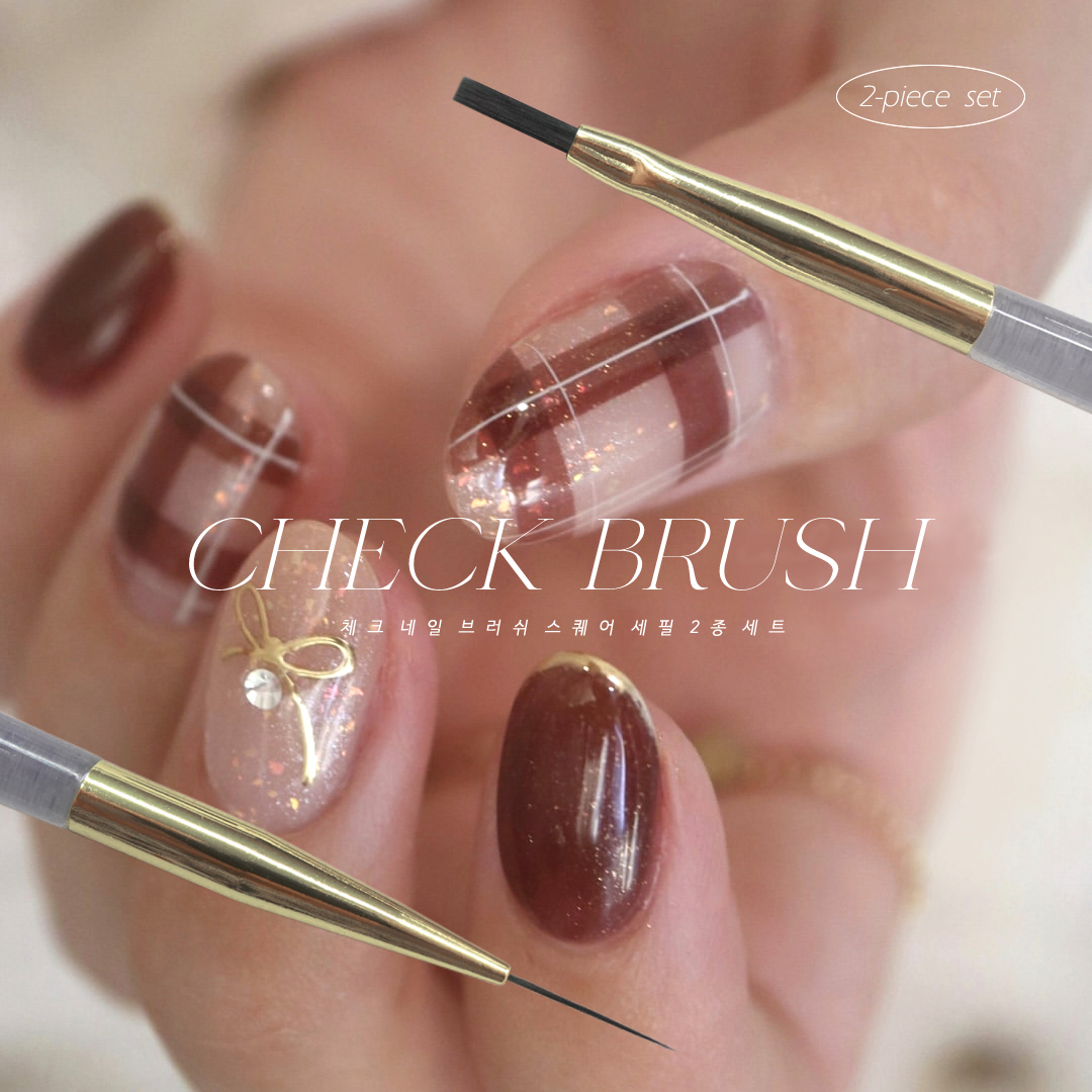 체크 네일 작업에 딱 맞게 구성된 4mm 미니 스퀘어 브러쉬 + 날렵한 롱 세필 브러쉬 2종 세트입니다. 부드럽고 탄력 있는 모라서 라인이 끊기지 않고, 스무스하게 발리면서 격자 무늬를 깔끔하게 표현할 수 있어요.
