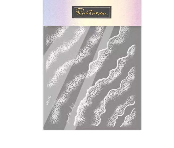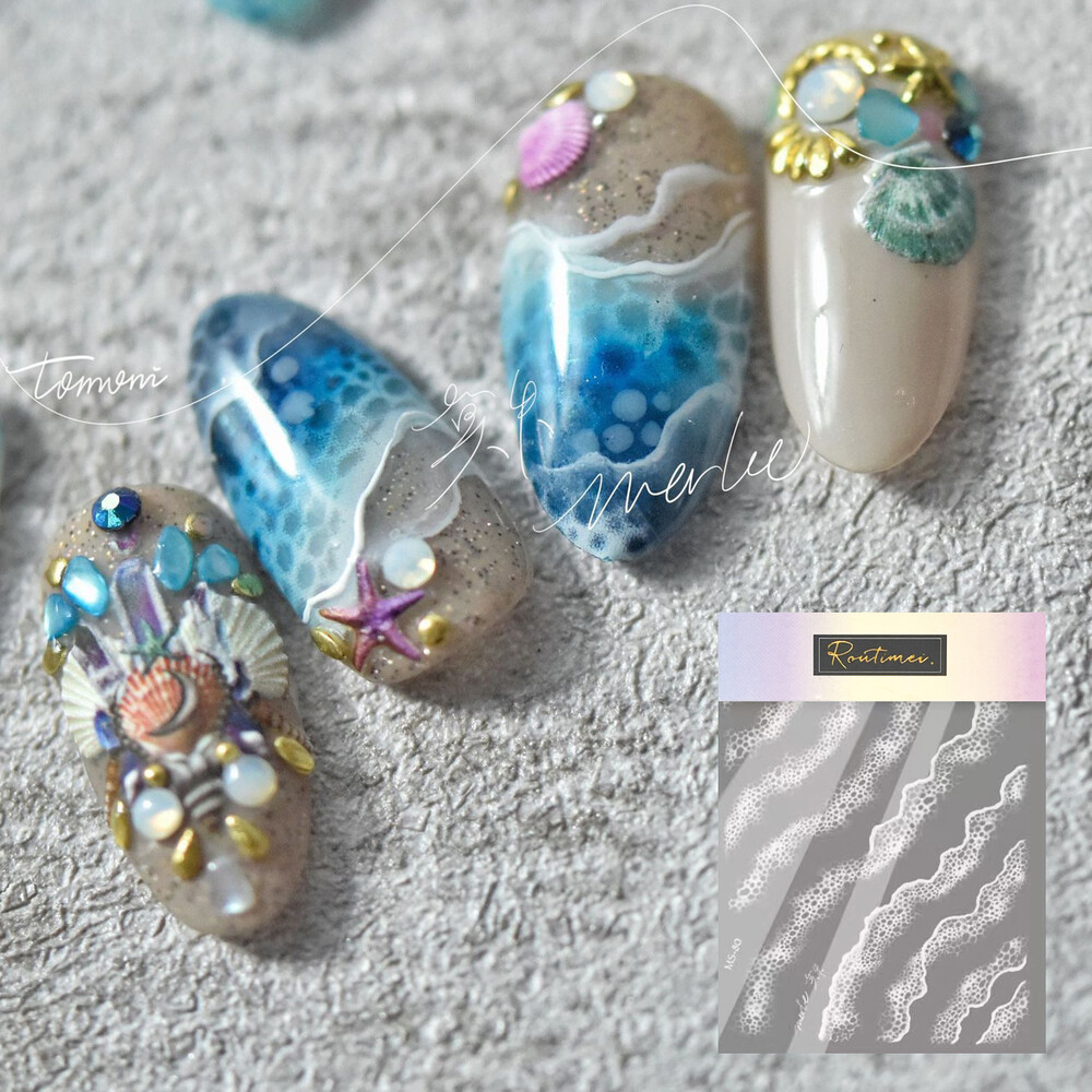 손이 많이가는 파도 무늬를 쉽고 간편하게 표현할 수 있는 화이트 물결 디자인 스티커 입니다. 기포 질감까지 느껴질 정도로 정말 리얼하고 고퀄이에요! 바다 네일로도 찰떡이지만 뉘앙스 네일에 활용하면 고급스럽고 예쁘답니다. ꈍ◡ꈍ