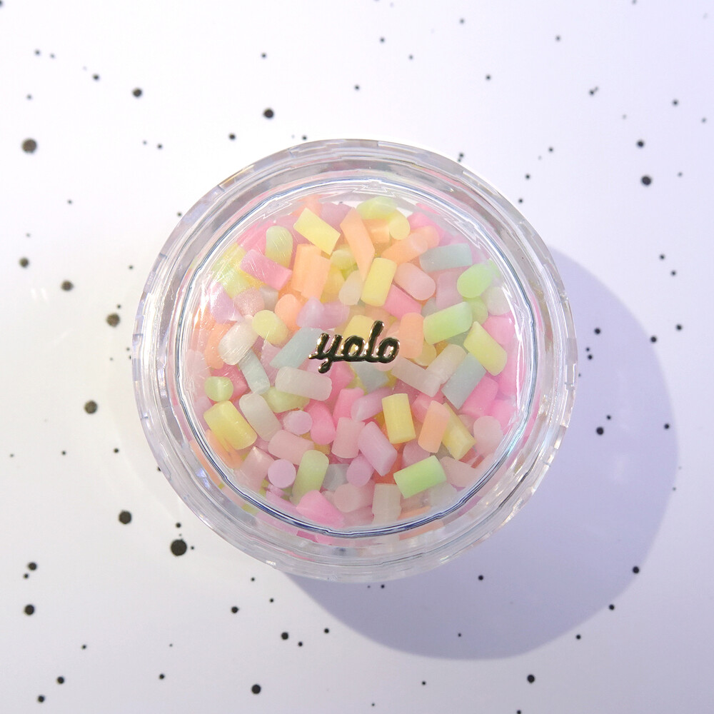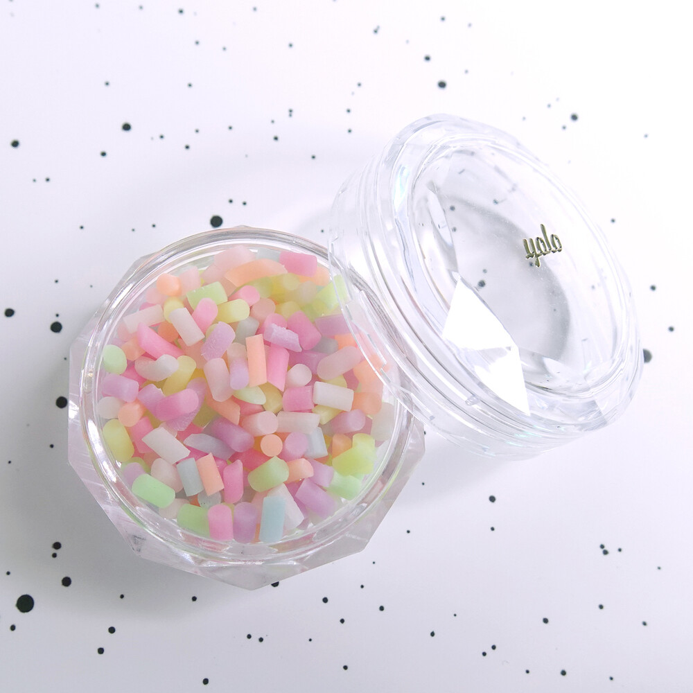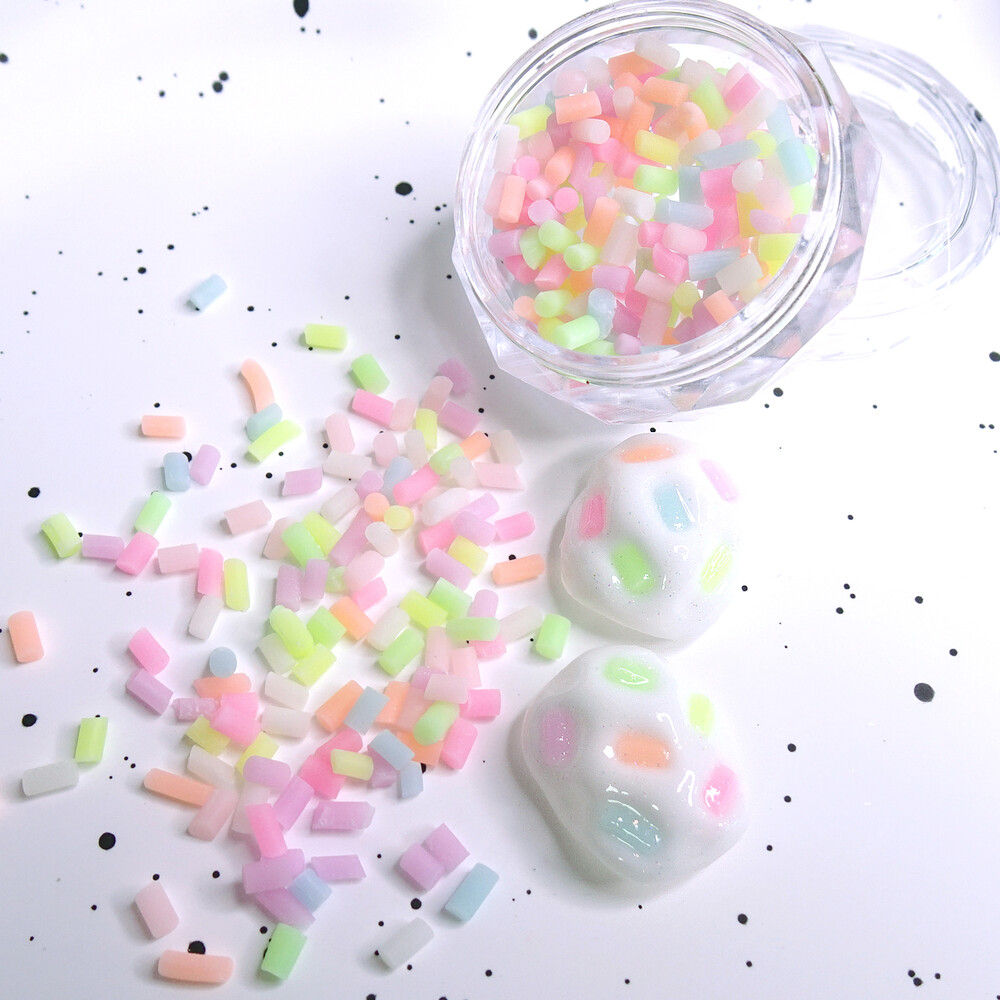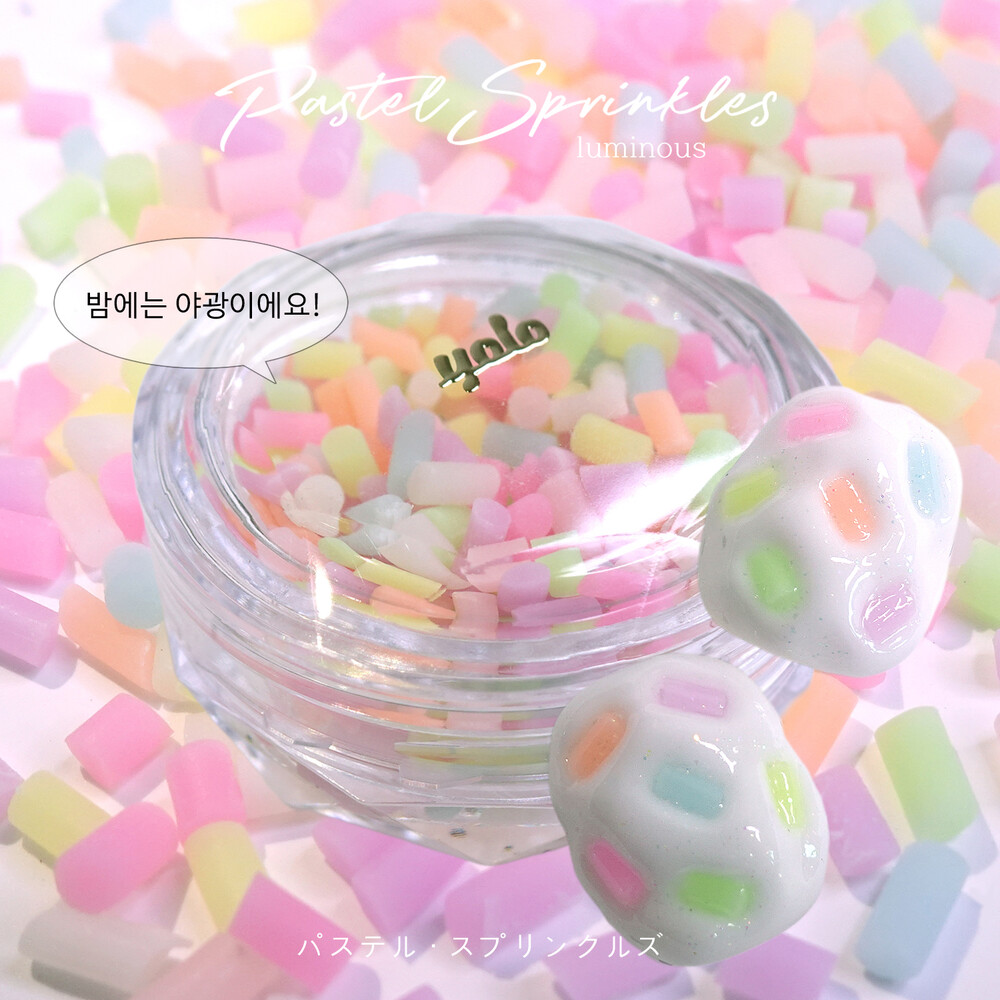 3D 토핑 네일로 귀여운 파스텔 스프링클스 글리터 입니다. 밤에는 야광으로 반짝이고 낮에는 알록달록한 파스텔 색감이 사랑스러워요 생크림네일 디저트 네일등에 활용해도 예쁘답니다 ♫꒰・‿・๑꒱