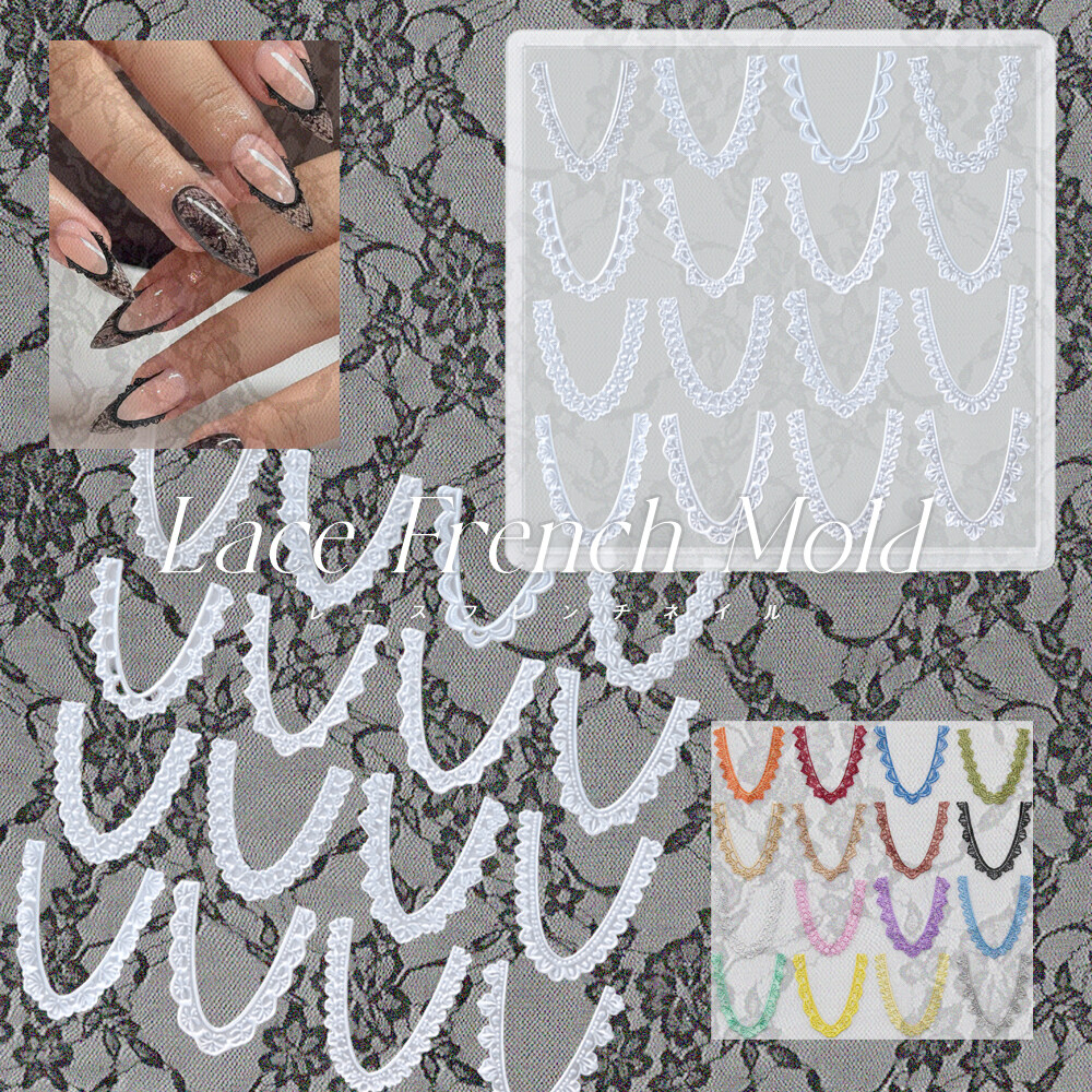 요즘 인기! 실크핏으로 손톱 커브에 착 밀착되는 레이스 프렌치 몰드입니다. 프렌치 아트에 레이스 디테일까지 더해주면 로코코 분위기에 빈티지네일이 완성 되어요.