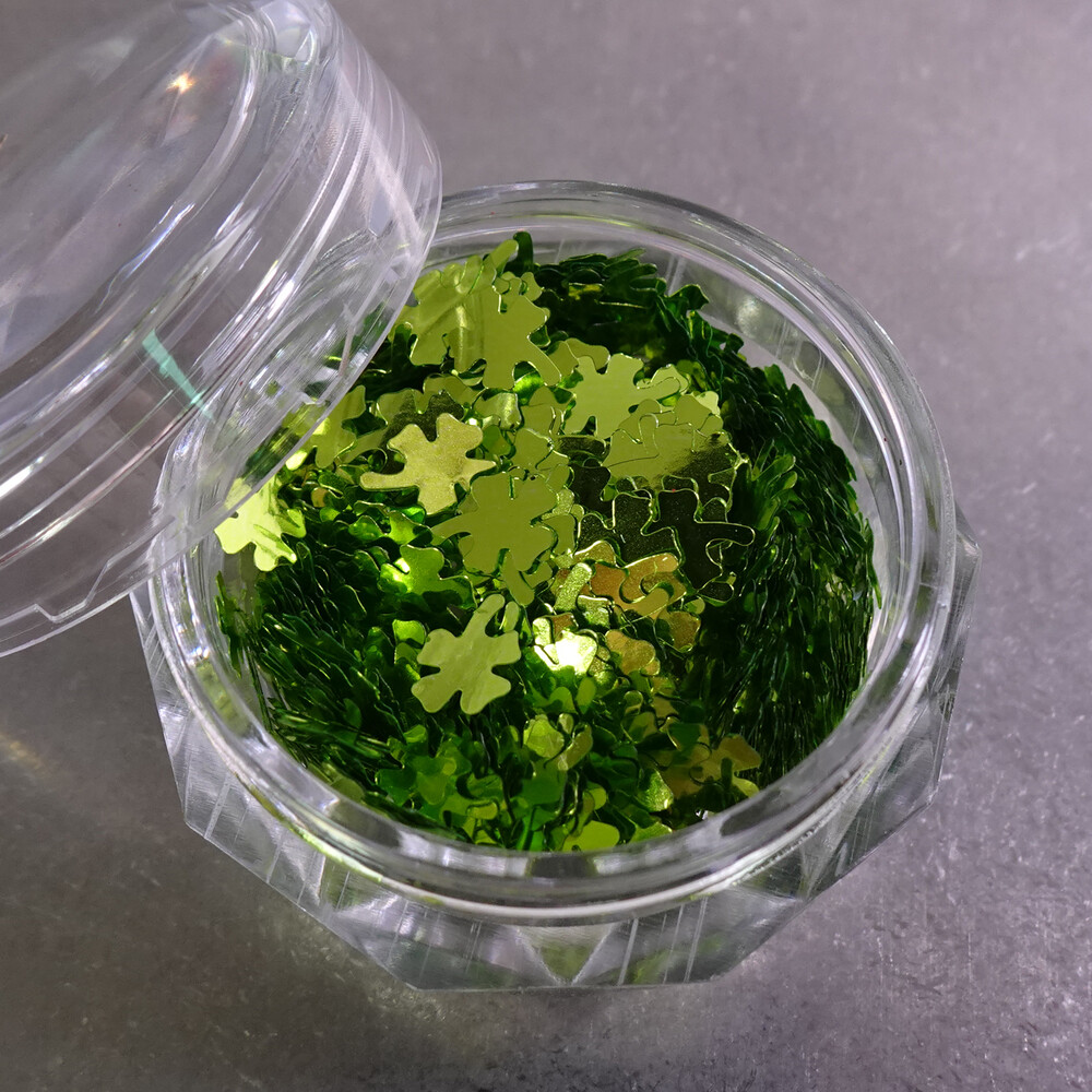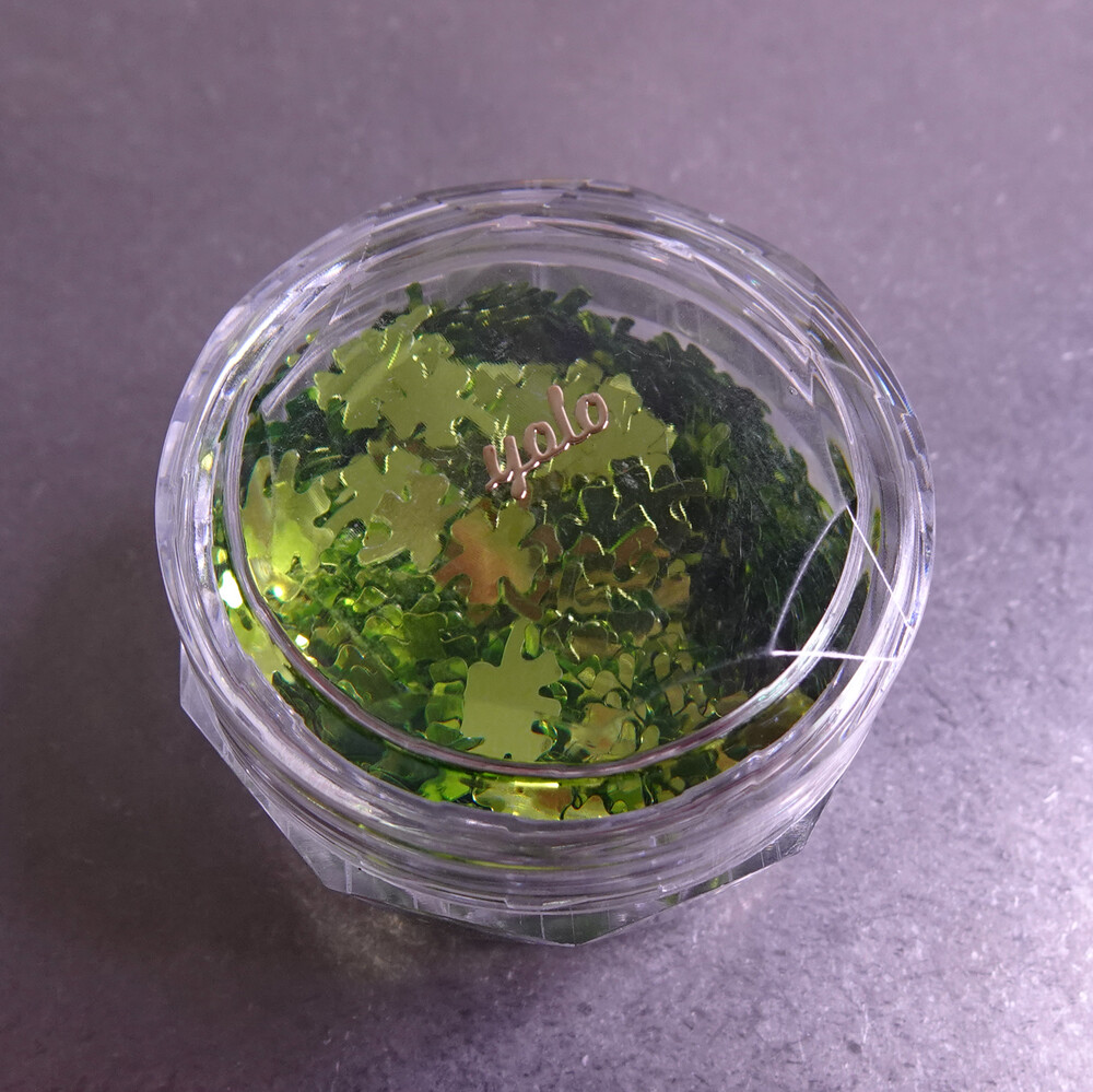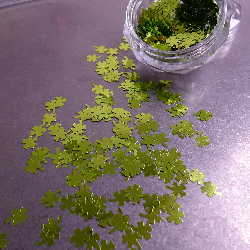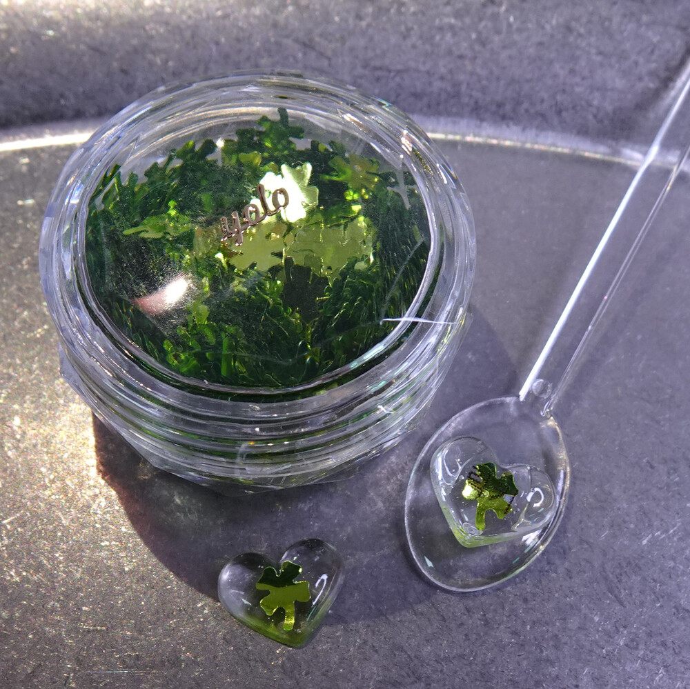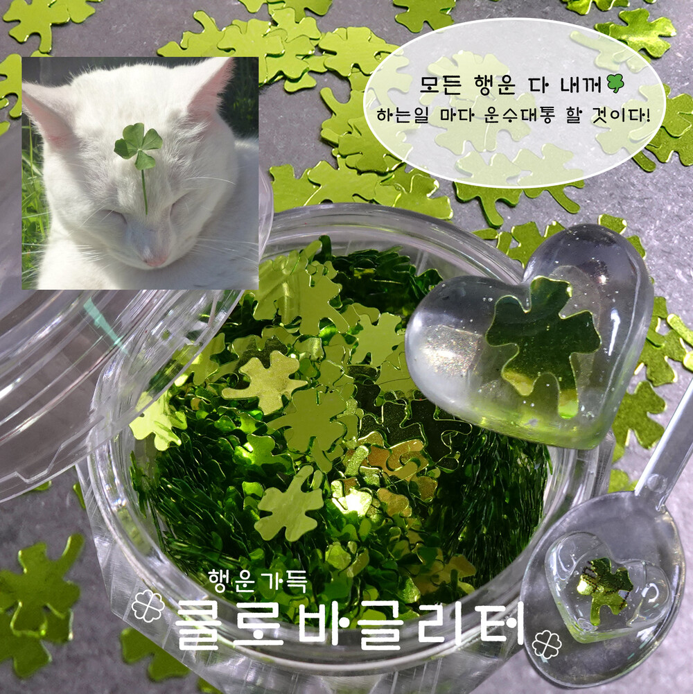 포인트로 귀여운 행운 가득한 네잎 클로버 글리터 입니다. 매탈로 빤짝반짝 레트로하고 힙해요. 별 다른 아트 없이 클리어 위에도 이쁘고 하트 파츠를 만들어도 귀여워요🤍