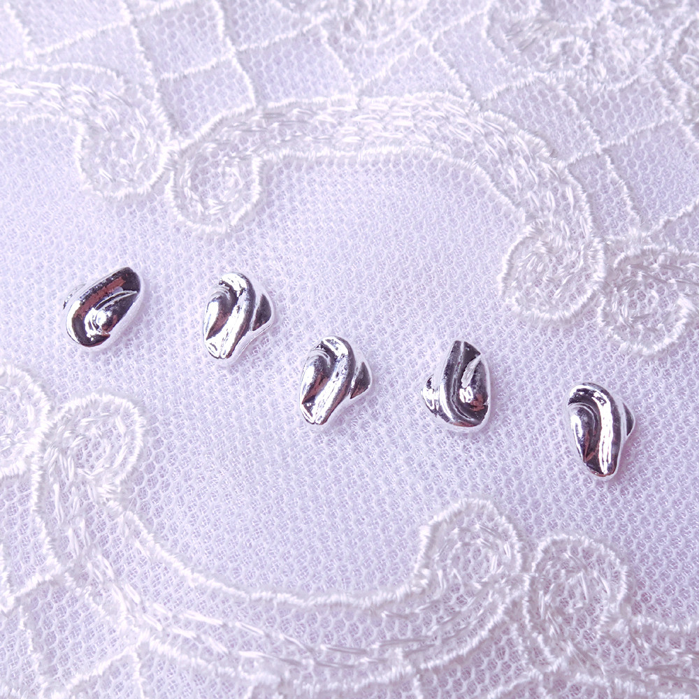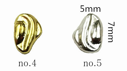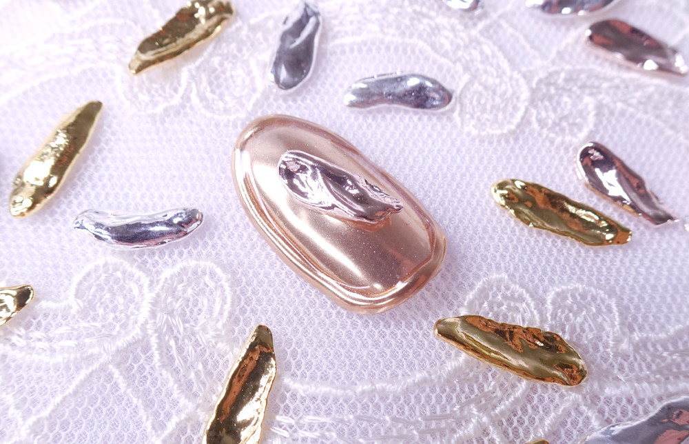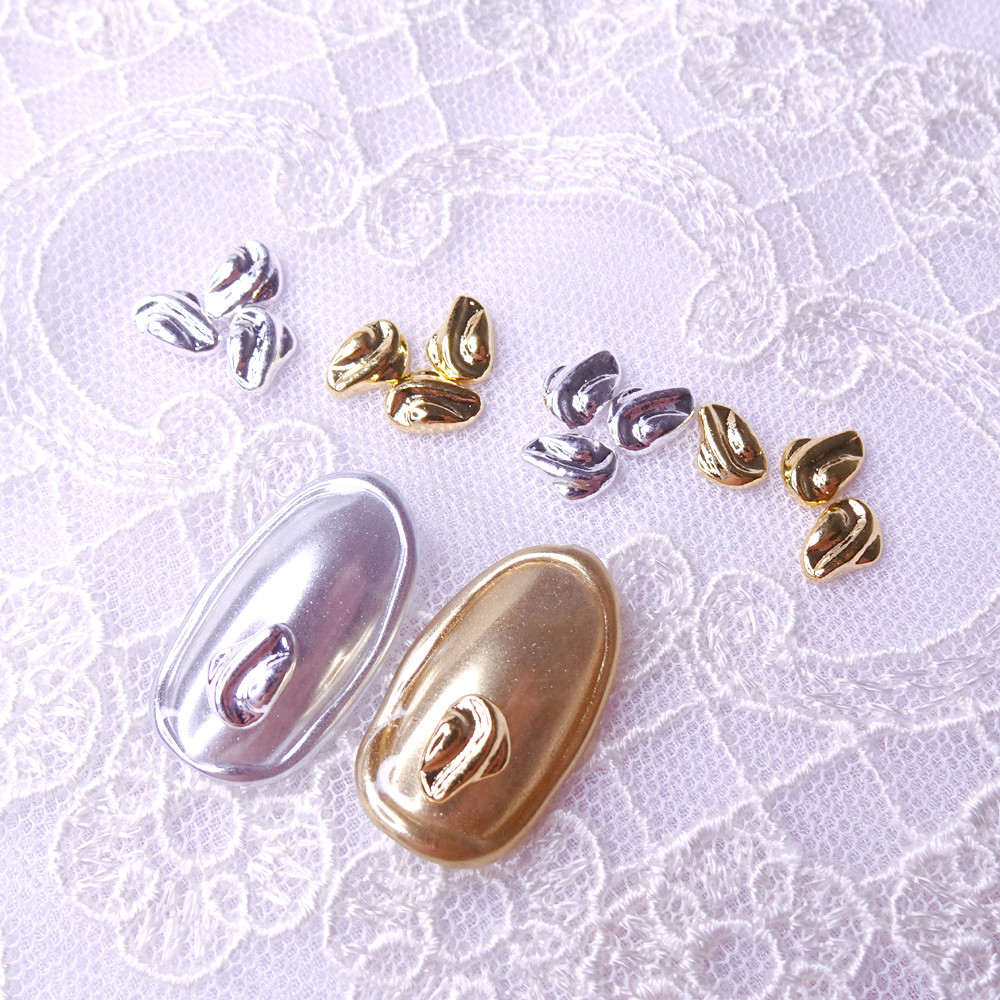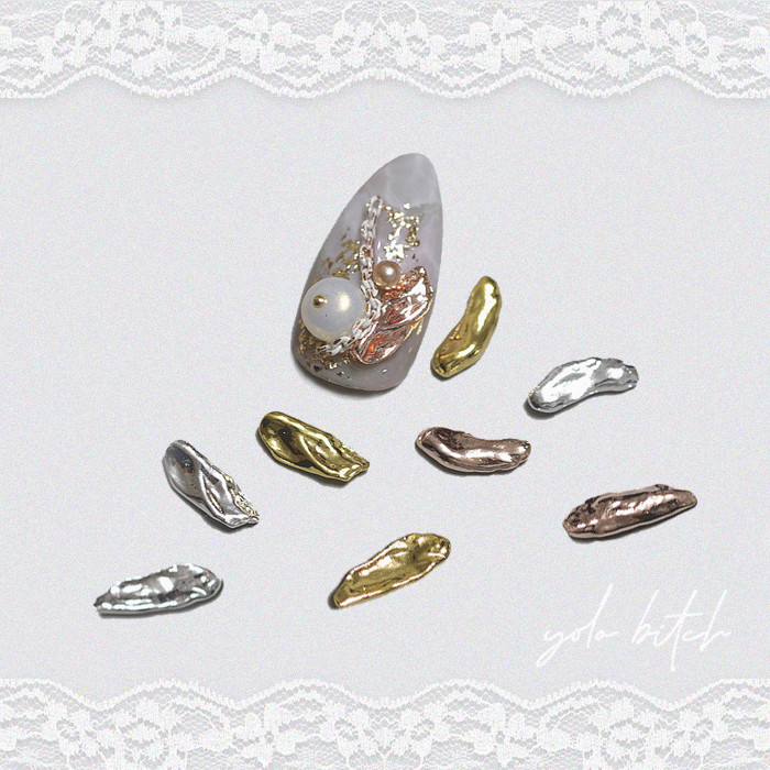 마블이나 뉘앙스 네일에 포인트로 하나씩 올려주면 느낌있는 볼드한 물결 모양 금속 스톤입니다. 베이지 오트밀 카키 등 시럽매탈 분위기 나는 오묘한 아트에 올려주면 고급스럽고 예뻐요 ♡⁼³₌₃