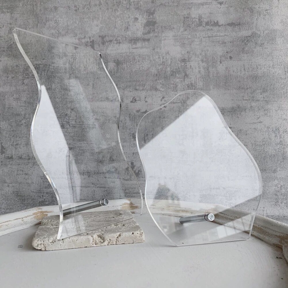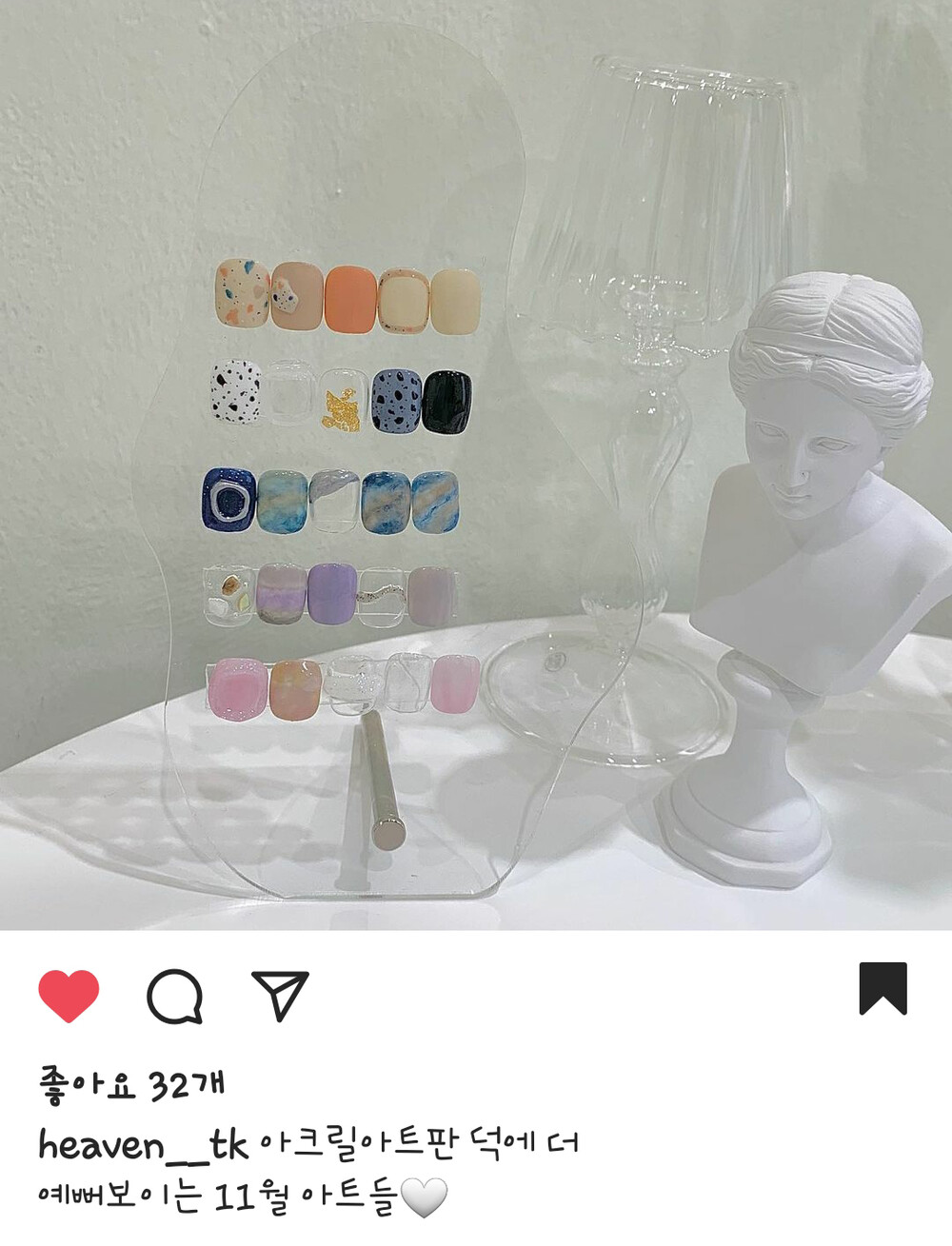 고급스러운 아크릴 소재에 심플하고 감각적인 신상 클리어 아트판을 입고했어요. 투명한 소재가 유행이라 샵에 디퓨저나 꽃들과 함께 진열해주면 트렌디하고 예쁘더라구요 (。•̀ᴗ-)✧ 미니멀한 사이즈로 수제 엠보 파츠나 컬러팁등을 디피해도 귀엽고 이달에 아트용으로 사용하시면 좋아요. 배송중 파손우려가 있어 받침대 나사는 분리되서 발송되오니 조립후 사용해주세요 (간단하게 돌려서 끼우면 끝나요 ^ㅁ^)